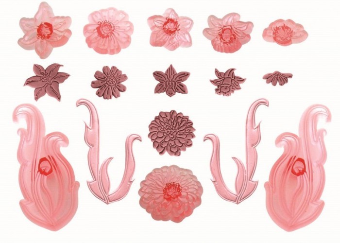 Floral Scrools ovvero stampi a forma di fiori e decori vari. Confezione contenente 8 pezzi come da foto prodotto. Gli stampi sono utilizzabili con pasta di zucchero e gum paste. Perfetti se spolverati prima dell'uso con un po' di amido.