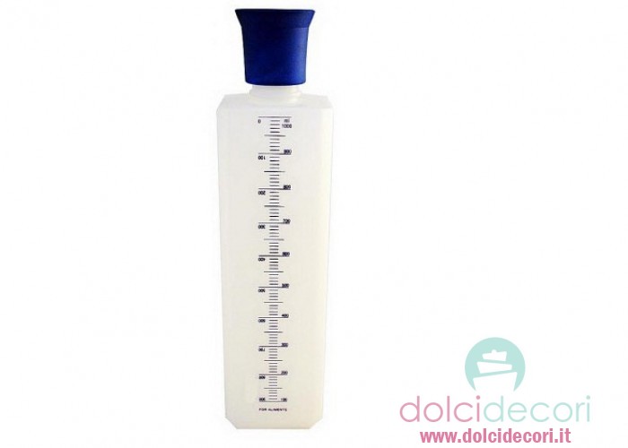 Bottiglia per bagna, utilissima per inzuppare il pan di spagna con precisione e senza sprechi. La bottiglia è graduata e ciò ti permette di controllare la quantità di bagna ottenuta. Acquista le bagne presenti nel nostro shop e dai gusto e aroma ai tuoi dolci. Dimensioni: 7cm x 23 h. Capienza: 1 litro.