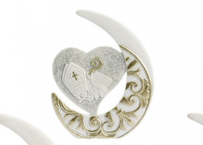 Elegante decorazione a forma di mezzaluna con cuore centrale, arricchita da simboli della Cresima in rilievo. Le finiture delicate nei toni del bianco e oro la rendono perfetta.