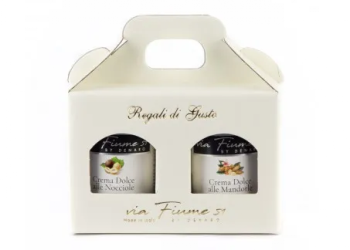 Un cofanetto elegante e raffinato, contenente due barattoli con deliziose creme, una ai pistacchi e una alle nocciole.