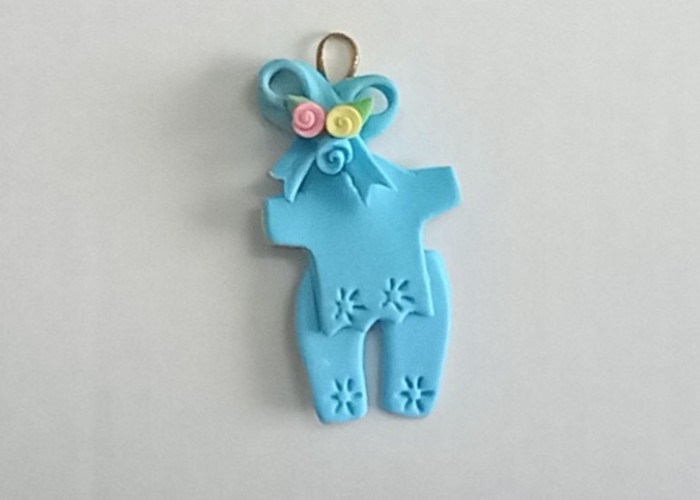 Un simpatico vestitino con fiocco e fiori piccoli, da poggiare su di un sacchetto nascita. Lo renderà sicuramente molto grazioso.