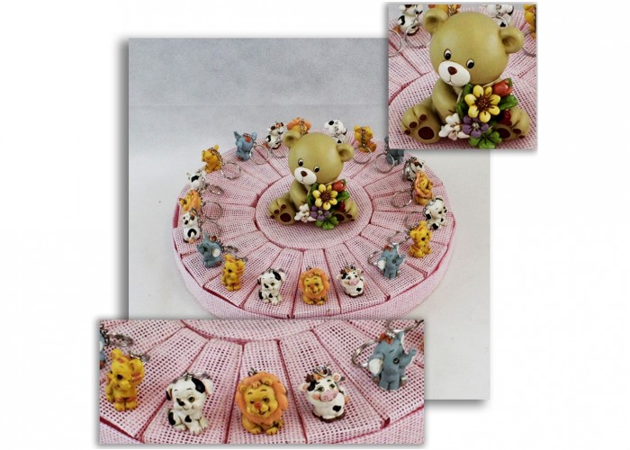 Una bella torta da presentare alla nascita o al battseimo. Una scatolina in rete rigida con sopra un bel portachiavi con animaletti. Per concludere il topper centrale è un salvadenaio che rimarrà come ricordo alla bimba.