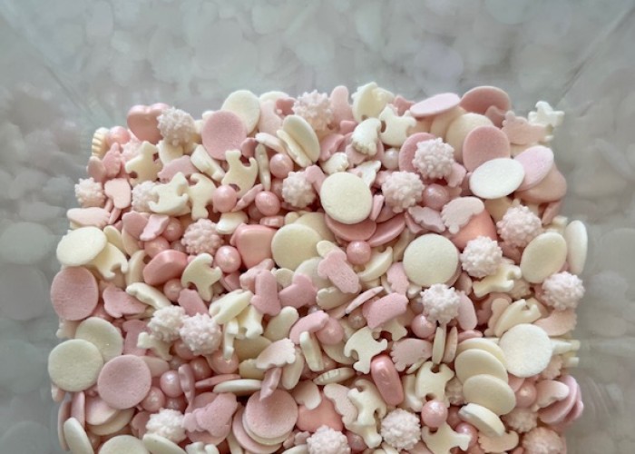 Un'idea per decorare con semplicità le tua torta battesimo bimba o nascita, i tuoi cupcakes, ti basta aprire il barattolo e spargere.