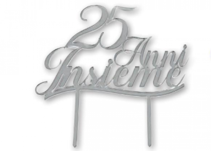Un topper semplice ma d'effetto perfetto per decorare la tua torta a tema anniversario, color argento, lunghezza circa 18 cm, in plastica adatta al contatto con gli alimenti.