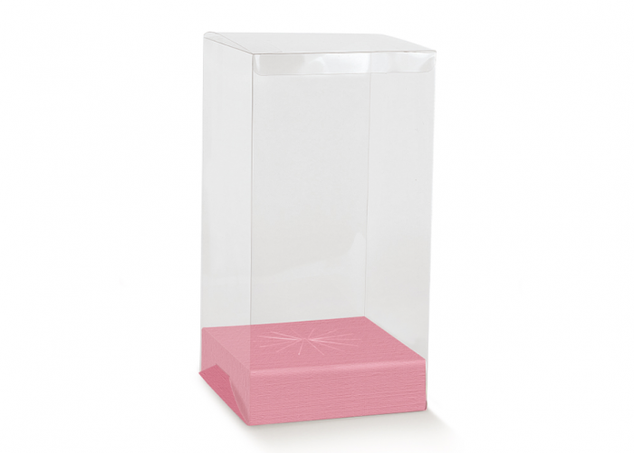 Scatola porta uovo in pvc con fondo in cartone di fibra rosa, ad astuccio. La base può essere utilizzata come contenitore per inserire una sorpresa senza dover rompere l'uovo. Le alette consentono il bloccaggio della parte trasparente. Si consiglia di utilizzare il blocca uovo per maggior sicurezza nel trasporto.