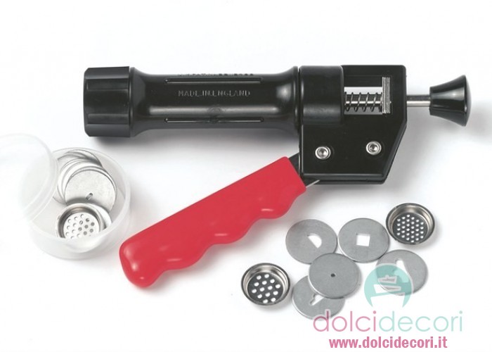Sugarcraft Gun, una pistola con 16 dischi intercambiabili con i quali è possibile creare diverse decorazioni. Grazie a questo particolare stampo per pasta di zucchero si realizzano: capelli, erbetta, torciglione di diverse misure, nastri. Gli stampini per fondente ti permettono di creare in maniera facile e rapida le tue personalizzabili decorazioni per torte.