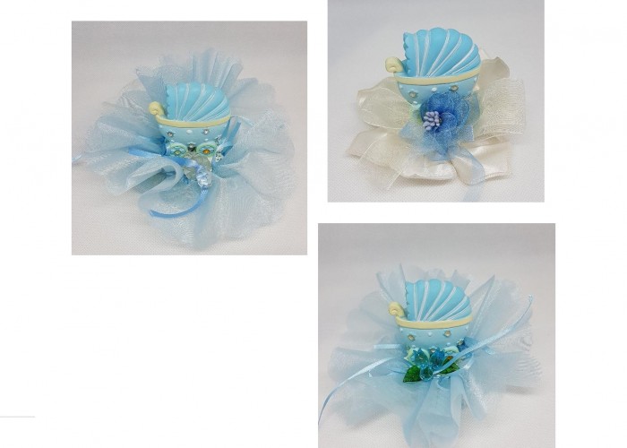 Culla in resina di colore azzurro con applicazione diverse l'uno dall'altro per una decorazione unica per torte di battesimo. Arricchiti con organza e tulle, fiori in vetro e ciuccio.