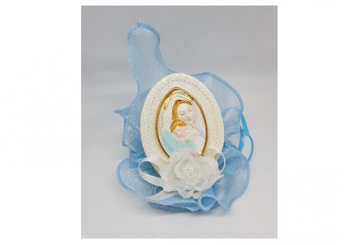 Topper ovale con maternità, organza azzurra, è il massimo della delicatezza per decorare torte di battesimo. Aggiungi fiori in zucchero e nastro effetto raso.