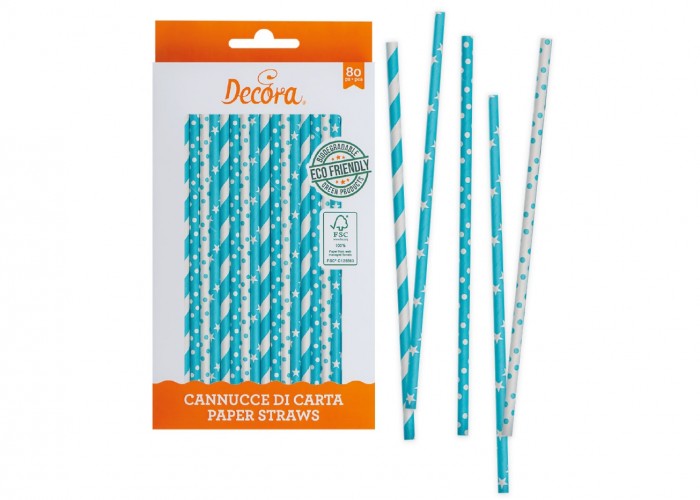 Di colore azzurro le cannucce in carta, colorati con inchiostro ad acqua. Crea, decora con fantasia sweet table, lollipop e tanto altro. La fantasia non ha limiti.