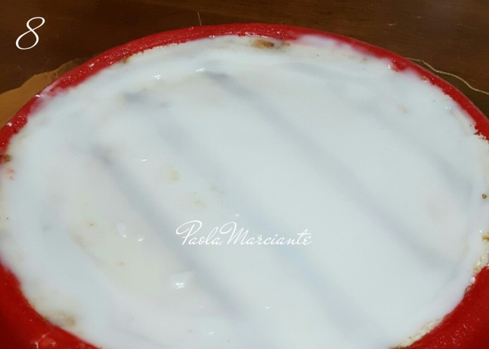 8. Quando la cassata sarà ben compatta e i profumi mischiati, capovolgetela su di un piatto e preparate la glassa fondente, mettendo in un pentolino lo zucchero a velo assieme a poca acqua, quanta ne servirà per ottenere un composto cremoso e ancora bianco. Non appena sfiorerà il bollore, il fondente sarà pronto per essere colato al centro della cassata e spalmato con una spatola.Fate la stessa cosa anche sui lati della cassata: come noterete, il fondente si asciugherà quasi istantaneamente non appena spalmato e dovrà avere una consistenza lucida e trasparente.
