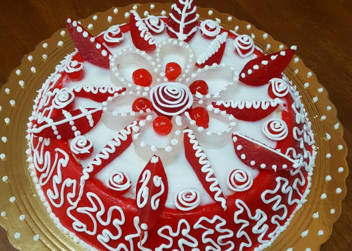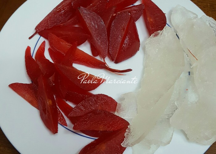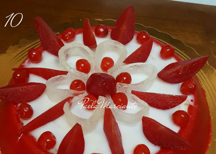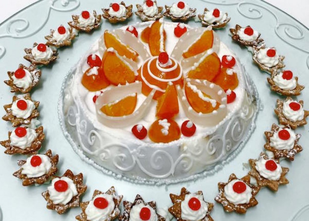 9. Ora potete passare alla decorazione della cassata: tagliate delle strisce di zuccata (zucca candita) e della frutta candita a pezzetti. Poggiate le fette di zuccata sulla cassata incurvandoli come per formare i petali di un fiore al centro del quale metterete, per esempio, un mandarino candito tagliato a metà. Il tocco finale sarà dato dalla decorazione con la ghiaccia reale, che realizzerete sbattendo un albume a neve e aggiungendo poco alla volta lo zucchero a velo fino ad ottenere una consistenza molto densa. Con una tasca da pasticciere munita di bocchetta con foro piuttosto sottile, create delle decorazioni sia sulla frutta che sul bordo della cassata.