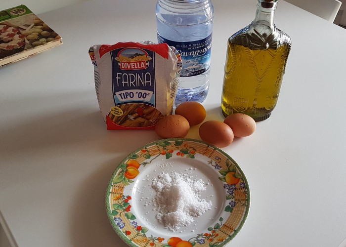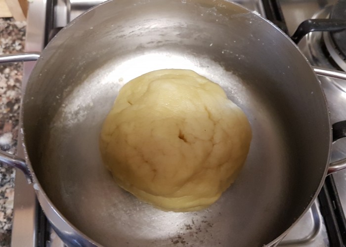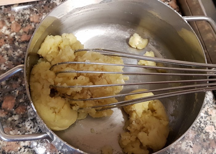 2. Procedete quindi con la preparazione: versate acqua, olio e sale in un pentolino, unendo – una volta raggiunto il bollore – anche la farina 00, mescolando gli ingredienti sul fuoco con un mestolo di legno per 2-3 minuti, fin quando il composto non si staccherà dal pentolino.