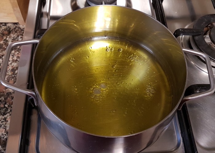 5. Prendete dunque una pentola e riempitela di olio per metà. Adesso attendete sino a quando l’olio raggiunge una temperatura di circa 160-180 C.