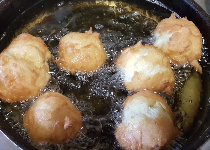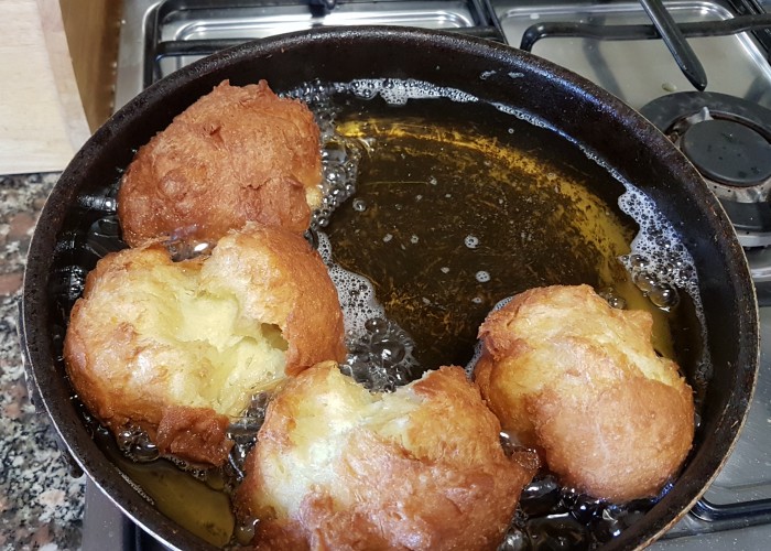 6. A questo punto bagnate due cucchiai nell’olio caldo, prendete una cucchiaiata di impasto e fatela scivolare nella pentola e far cuocere, per circa 12 minuti, immergendole continuamente, piano, piano si cuociono la pasta si apre e si girano da sole, continuare la cottura cuocere senza avere fretta.