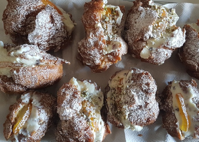 7. Una volta pronte, farcitele con la crema di ricotta, scorza d'arancia e granella di pistacchi.