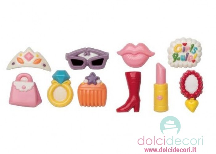 Stampi per piccoli cioccolatini con 10 disegni suddivisi in 2 stampi. Cioccolatini ottenuti: rossetto, scarpa, stivale, corona, occhiali, anello, borsa, labbra.